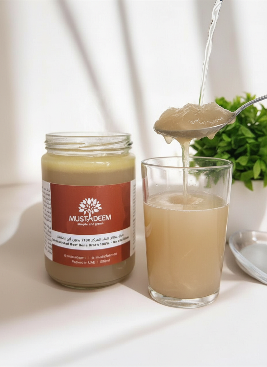 مرقة عظم بقرية مطهوة ببطء لساعات طويلة لاستخلاص الكولاجين الطبيعي والعناصر الغذائية المركزة، لتكون خيارًا غنيًا ومغذيًا يدعم الصحة اليومية للمرأة والأطفال وكبار السن. سهلة الهضم وكثيفة غذائيًا، ومناسبة للأطفال من عمر 6 أشهر فما فوق.